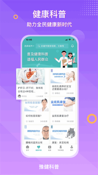 1.汇聚了很多的养生专家和医学达人在线互动,分享自己的经验,通过豫健科普软件跟着专业人士呵护自身的健康。