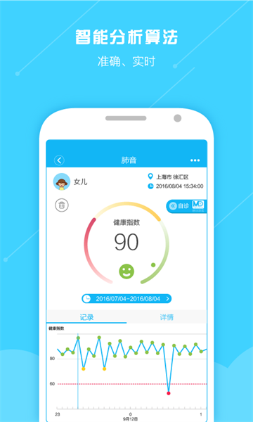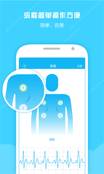 智能听诊器采集肺音,同时支持实时监听和手机录制回放,高清肺部音,历史记录一目了然,独创健康指数专利算法,辅助诊断配合权威自诊,年轻父母可独立使用。