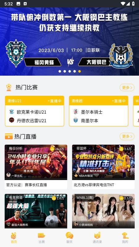 2、全球足球、篮球、电竞、网球等各级别赛事直播,主播面向全平易近开放