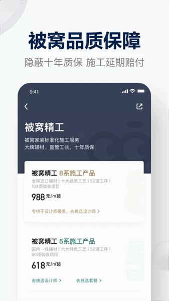 2、整装标准化套餐,设计、施工、主辅材料一站式省心全包;