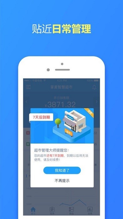 超市管理大师app是一款专为中小型个体及连锁超市设计的saas管理软件,以移动智能化管理和营销为主,满足连锁的专业化管理需求。应用采用云数据存储技术,使经营数据安全,节约传统软件带来的服务器维护成本。其采用电脑、手机双平台互通管理,掌握店铺运营情况,实现移动化管理。