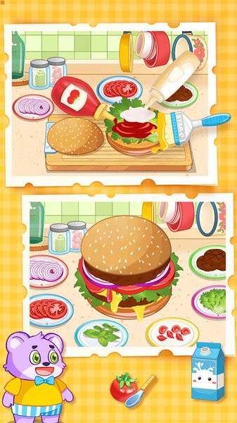 《宝贝汉堡店》是主打模拟经营的儿童益智休闲类教育应用。你将扮演一名知识渊博,经验老到的美食烹饪家,为顾客们呈上一道又一道美味佳肴,小到芒果芭菲的甜点,大到制作美式巨型汉堡王,让我们一起来做出各种各样好吃的料理,并经营餐厅吧!