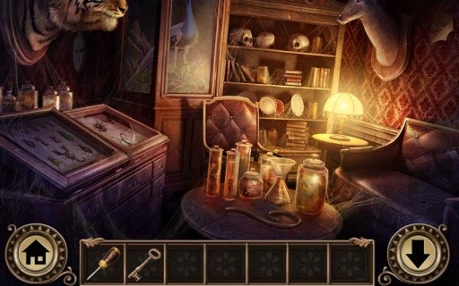 9、回到酒窖口,用锤子把花瓶砸开,获得一把钥匙。使用钥匙打开过道左边的门,进去后是【标本室】。中间桌了上获得一根皮管,左右墙上分别有个虎头和鹿头。点击虎头,将红宝石安装在眼睛上,获得一把大银钥匙(Large Silver Key)。点击虎头下方的标本盒,发现少了个蜘蛛。