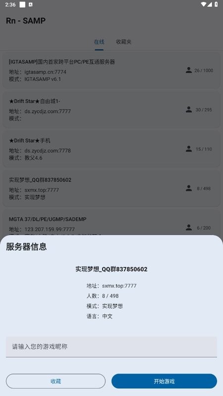 samp联机工具手机版(samp圣安地列斯联机)是专为gta玩家打造的联机平台,软件提供了很多服务器,玩家可以直接加入,和其他玩家一起游戏;同时,你也可以自建房,拉好友来一起玩gta,玩侠盗飞车必备工具。