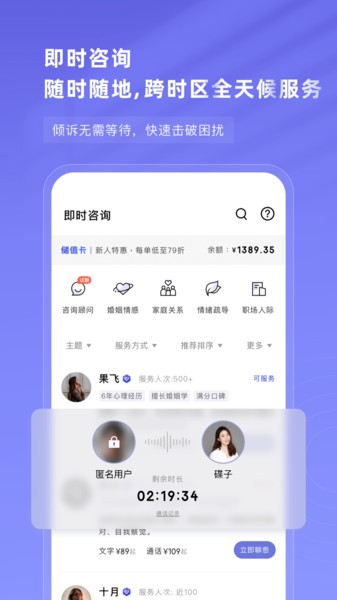 1、根据用户需求和心理状况精准匹配适合的咨询专家,涵盖婚恋情感、亲子教育、职场压力、情绪困扰等多个领域。