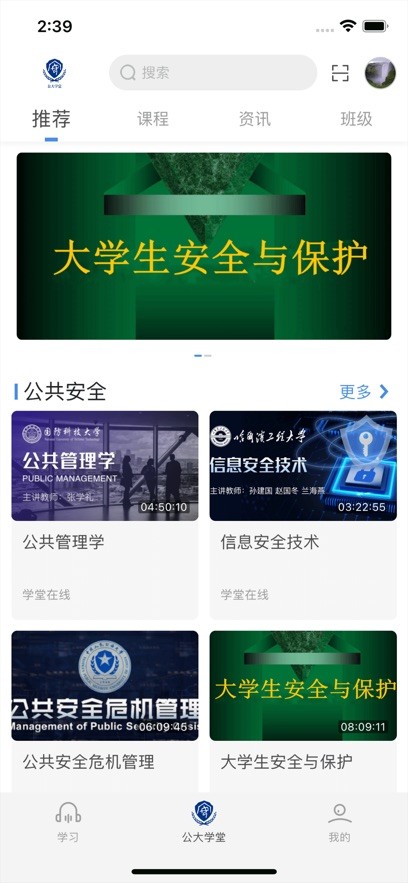公大学堂在线手机app主要含有各种安全知识教育,有必修课也有选修课,可以加入班级进行学习,可以查看自己的课程以及详细的学习档案,还可以在线查询证书,公共安全、信息技术安全等知识一应俱全,众多好课随时学。
