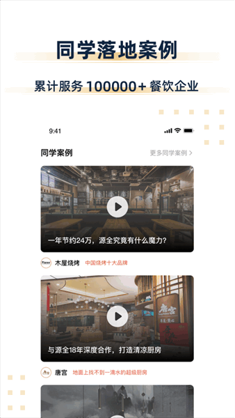 累计服务10w+餐饮企业。你的学长有:木屋烧烤、唐宫、西贝莜面村、老乡鸡…