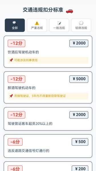 提供了详细的交通违规扣分标准,包括酒后驾驶、醉酒驾驶、驾驶营运客车超员等违规行为的扣分和罚款情况。