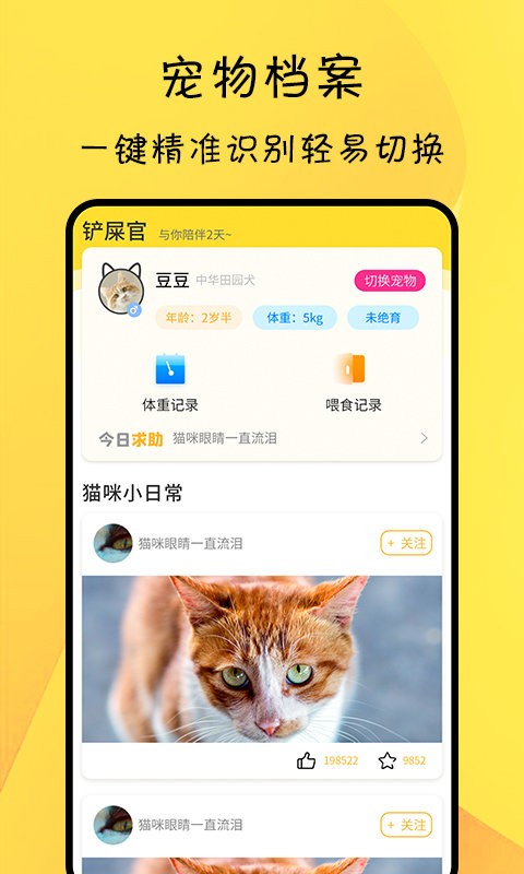 “分享主子的美好生活”,猫咪翻译器涵盖了铲屎官日常生活中常用的工具,你可以通过文字、图文等形式记录猫咪日常动态、体重、喂食、病例、花销账单等。