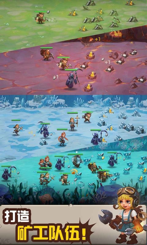 自由升级组合,建立起自己的专属阵容,壮大全新的强大矿工队伍