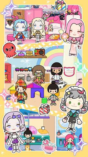 来体验《魔法迷你城市》的梦幻时尚世界生活!这里有上百种场景等待你的探索,包括:中央购物中心、美发沙龙、网红美食城、夏日水上乐园、摩天轮游乐场、农家乐度假村、冰雪大世界、彩虹公寓等,甚至还有专属别墅小家!