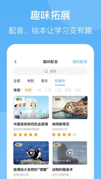 youtoo爱听说高中版软件是专为高中学生打造的英语听说训练app,能够在手机上进行听说测评,纠正错误发音,可以完成课后习题,题型丰富多样,可以根据自己的实际情况进行针对性训练,有非常丰富的电影纪录片以及音乐资源,支持进行趣味配音。