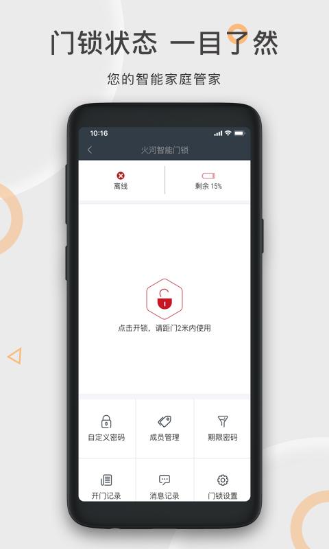 1、通过火河科技APP,用户可以更好的实现对房屋门锁的管理和监控,特别适合于二手房交易中,房东远程分配开锁权限,不需去现场就可以实现买客看房的功能,对于短租模式的房东来说,也可以远程完成房屋的出租管理。