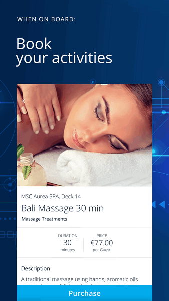作为地中海辉煌号上的数字体验的一部分,我的MSC应用可以帮助您充分享受邮轮之旅。这个应用操作简单,可以协助您在船上导航,预订船上服务和管理个人活动。所有的功能都为您定制,让您的航程安心愉悦。