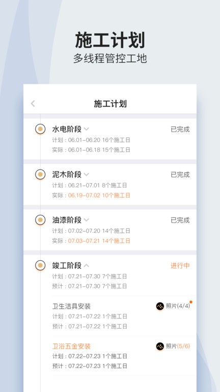 您的家您随时可以去查看施工进展,如果您没时间去查看,我们过家家APP随时都可以查看工地进展,项目经理每周多次的现场照片更新,让您随时随地掌握工地详情。