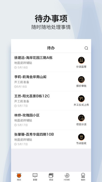 过家家移动ERP软件app是为装修监理打造的移动办公工具,支持在手机上查看每天的待办事项,可以及时查看项目的进度,支持和客户进行沟通,可以在线参与报价,查看最新的施工和验收标准。