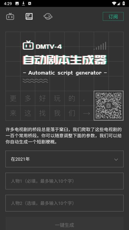 自动剧本生成器最新版是可以帮你智能创作生成剧本的应用app,界面高清简单,操作便捷,通过输入年份时代、关键人物,灵活调整参数,点击一键生成即可快速生成短剧梗概,剧本内容新颖独特,带来全新的剧本体验,使用十分方便!
