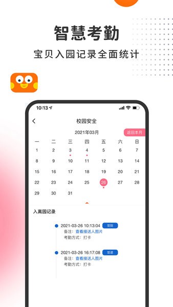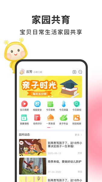 入园离园信息,实时推送安全可靠,家长更放心;班级生活大小事,照片视频轻松展现;打造丰富多彩的班级圈,家长实时接收学生考勤及体温信息,实现家校之间健康打卡,校园通知等