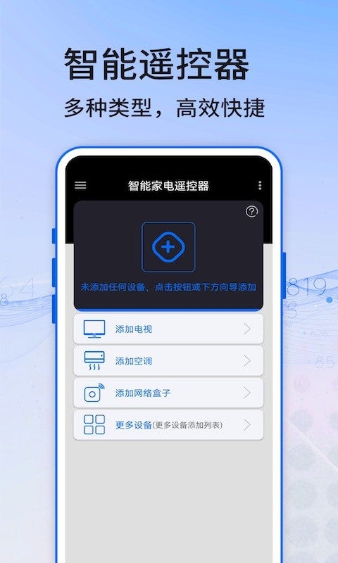 智能家电遥控器,好用的智能家电遥控器设备,用户可以通过手机智能进行设备的遥控控制,连接自己的智能家用电器,软件支持多种家用电器设备的遥控服务,使用十分方便,软件控制功能强大,有需要的用户可以下载使用!
