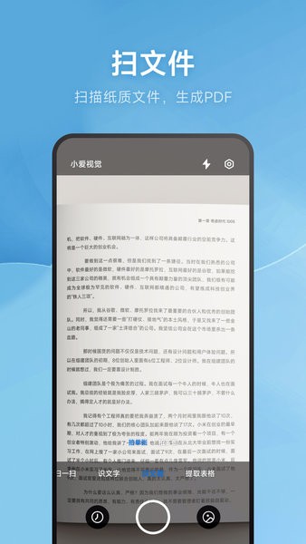 小爱视觉(原扫一扫)是小爱同学的眼睛!它是由小爱团队研发出品,集扫一扫(扫码识物)、识文字、提取表格、扫文件、翻译、扫名片多个功能为一体的智能扫描软件。