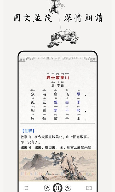 2、图文并茂,拥有诗文的插画匹配正文的大意,方便学习和理解;
