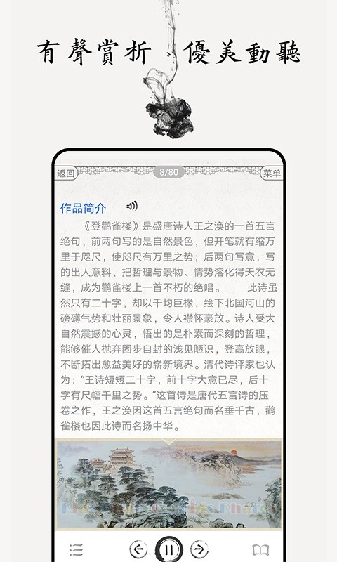 主要功能:每一首诗词的内容均配有“白云出岫”老师深情的朗诵、准确的拼音、全面的注释、甜美的译文、易懂的启示、有趣的故事、水墨风图画、还有实用/易用的跟读背诵学习功能。