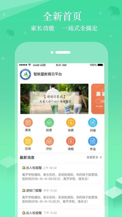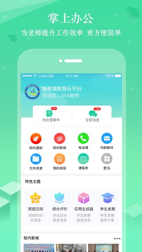 智教星app官方最新版作为家校互动软件,教师、学生以及家长均可使用,教师可以在手机上查看每天待处理事件,能接收最新的校内通知和新闻,可以发送和查收内部邮件,有非常详细的电话簿和课程表,学生和家长能在线参与问卷,支持在线请假和查看作业安排。