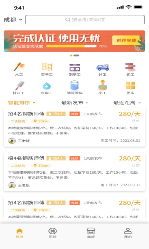 建筑招聘电商平台帮助工人找工作,帮助招工者招人,集合建材类商家,打造一站式建筑人才及建材电商综合平台。