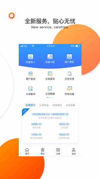 -- 丰富的首页工具应用,该页面中设置了商户信息、终端信息以及交易查询等应用工具