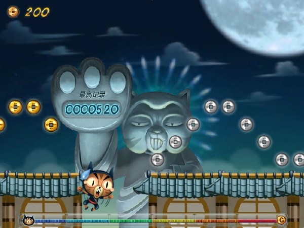 3、每过一关速度就会变快,后面的大猫瞪大眼睛表示超出记录或者进入下一关卡,如果眯眼则表示一组金币全部吃掉或者即将翻楼。