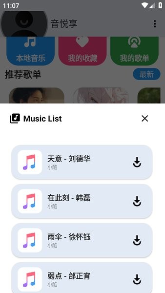 音悦享界面真的超级简单,就只有一个主界面,没有任何其他的了;但是别看它小,真的比太多听歌app强多了,免费这一点有几个能做到,同时还可以下载音乐,歌曲还多,新歌老歌任你听。