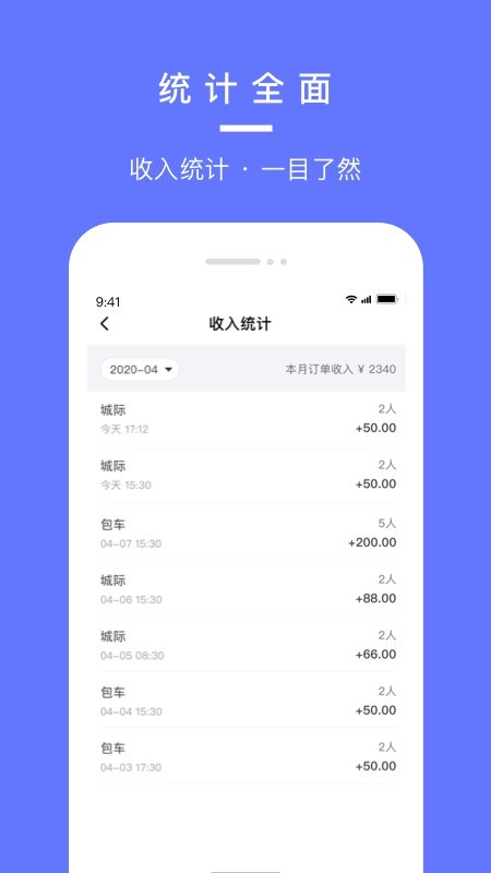 7、自动统计收入,司机每日的、每月的出车收入统计结果随时查看;