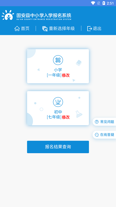 4、网上报名结束后,可点击系统下方“报名结果查询”,输入学生姓名和身份证号码可以查询初审结果;如未通过初审的请修改后进行重新提交;如果通过初审的打印“入学复审表”; 按照“入学复审表”上规定的时间到指定学校复审,到学校现场复审时,复审时需携带“入学复审表”、网上报名提供的相关证件材料原件及复印件(固安县域外小学毕业生入读初中需持由毕业学校从全国学籍网打印的《学生学籍信息表》)到学校现场查验。
