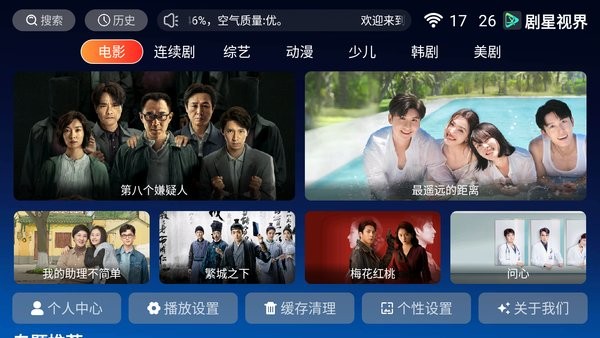 剧星视界电视版是手机App的TV版本,能直接在大屏上看电影、电视剧和综艺等内容。这个应用功能挺强大,可以搜索想看的内容,还能记录观看历史和设置播放,方便随时继续追剧。它有高清播放体验,资源也很丰富,全球超过1万部影视作品都能看,还能智能推荐符合你口味的片子。