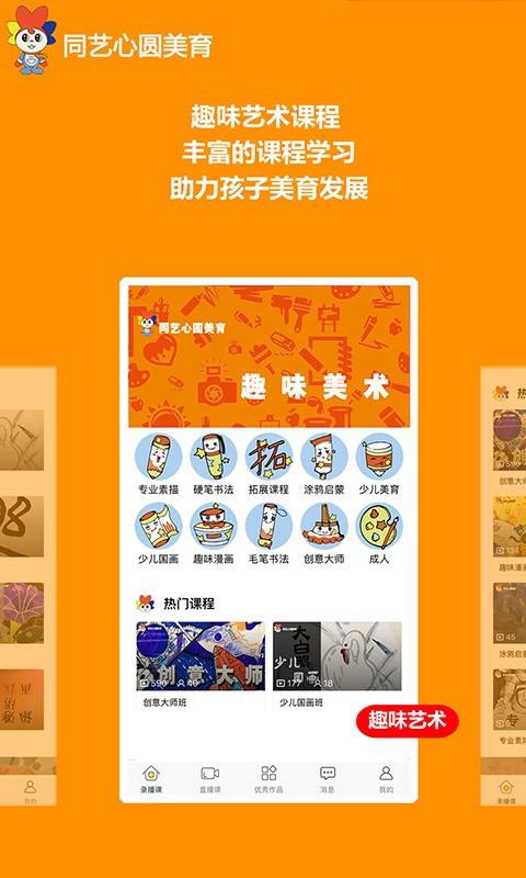 同艺心圆美育是一款艺术培训软件,致力于培养优秀的美术学员,帮助学员成就自己的未来,软件提供丰富的线上美术课程,帮助学员很好的发挥自己的美学天分,充分展示自我,创作优秀的作品,有需要的用户可以下载使用!
