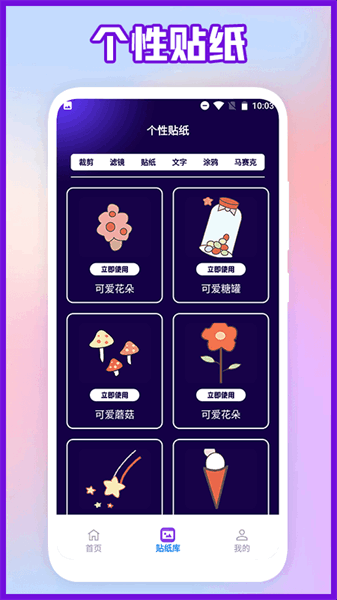 2、拥有超多的优质的背景图库及贴纸,任意更换想要的背景或选取相册自定义的添加;