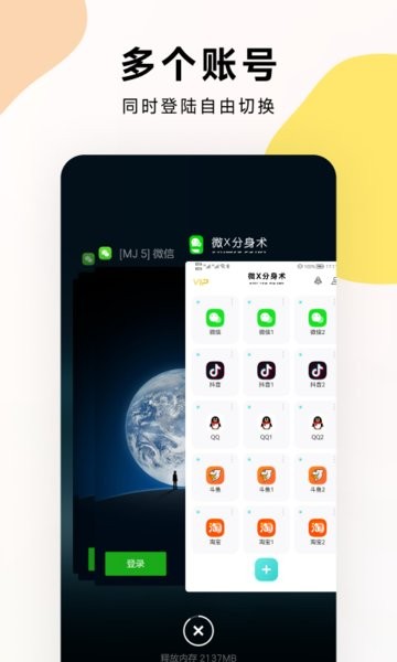2.聊天多开:通过实现多开社交聊天APP,告别社交账户来回切换的烦恼,让你尽情分享,放肆聊天,工作生活两不误
