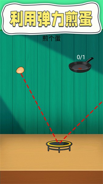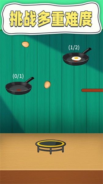 把鸡蛋扔到锅里,找准投射的方向和时机,游戏里的鸡蛋可是会不断弹跳的。考验你手速的时候到了,点击拖动弹簧床别让鸡蛋掉到地上哦!