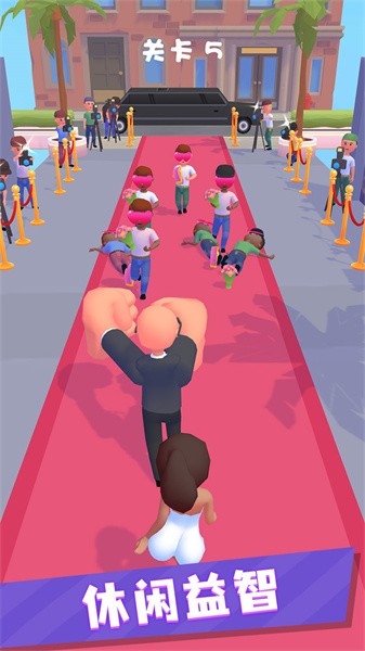 保镖救救我游戏手机版中你扮演一名保镖的角色,你的任务就是保护各路名人,在红毯上会出现很多狂热粉丝,你需要挥舞你长长的大拳头击退挡路的人,安全权护送名人行走到达目的地,欢迎感兴趣的朋友下载体验!