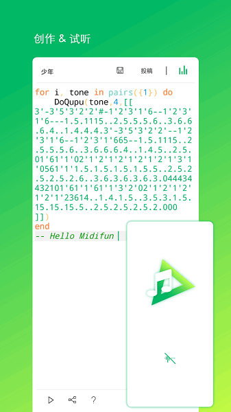 音乐编程是一款便捷的乐曲创作软件,软件提供各种音律的简谱代码,用户可以自由的发挥自己的音感来进行编谱创作,编写各种好听的音乐效果,软件还支持对各种格式的音频文件进行再剪辑,有需要的用户可以下载使用!