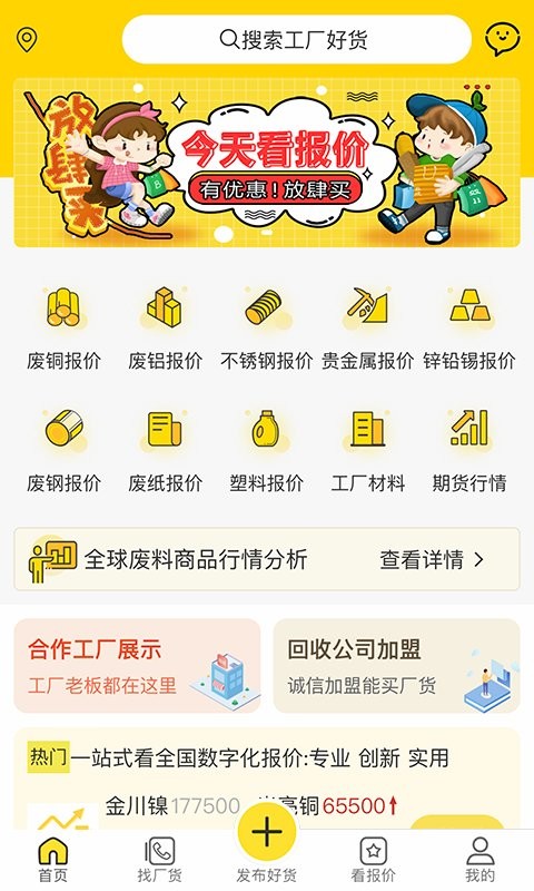 工厂回收网app软件能够在手机上查找货源信息,包含的废料种类丰富,各种金属、工厂材料、塑料等一应俱全,可以查看最新的商品行情信息,能够在线发布废品货源,可以查看详细的报价信息,回收交易更方便。