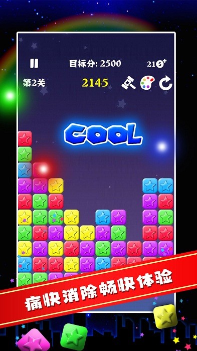 消除之星安卓版趣味性十足的一个点击消除手游,动感的爆破音效令人感到非常解压,各式各样的关卡等你来挑战,找到相同颜色的方块,并点击它们即可消除,来看看你能挑战到多少关卡吧!
