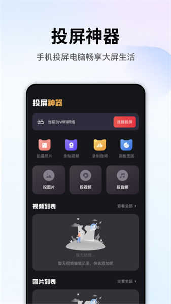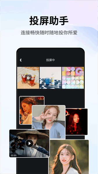 手机畅联投屏这是一款极速投屏、投媒体文件的投屏神器,轻松助你将手机、屏幕投射到大电视上,画质清晰,实时稳定,且操作简单,上手即用!可投屏内容包括图片、视频、音频、画画板等!还在等什么,快来体验吧!