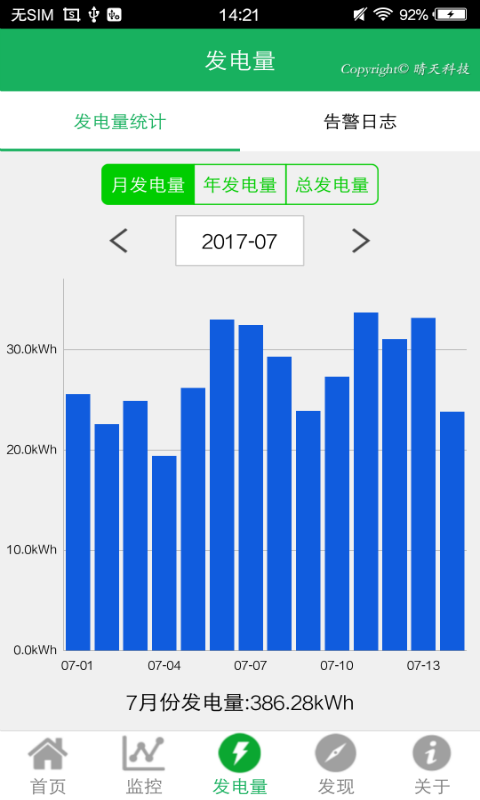发电量概况,应用会为客户统计过了所有发电站的年发电量、月发电量、总发电量;