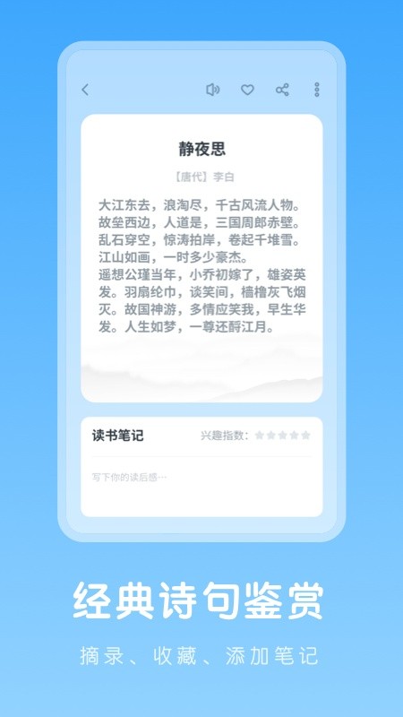 【丰富资源】收录了诗词文言、热门名句、历朝诗人等众多经典之作,给你提供一个纯粹的欣赏空间。