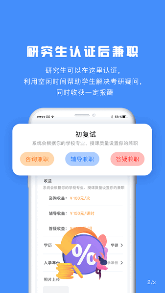 3、研究入驻,一些研究生可以入驻到平台,需要完成研究生认证就可以兼职。