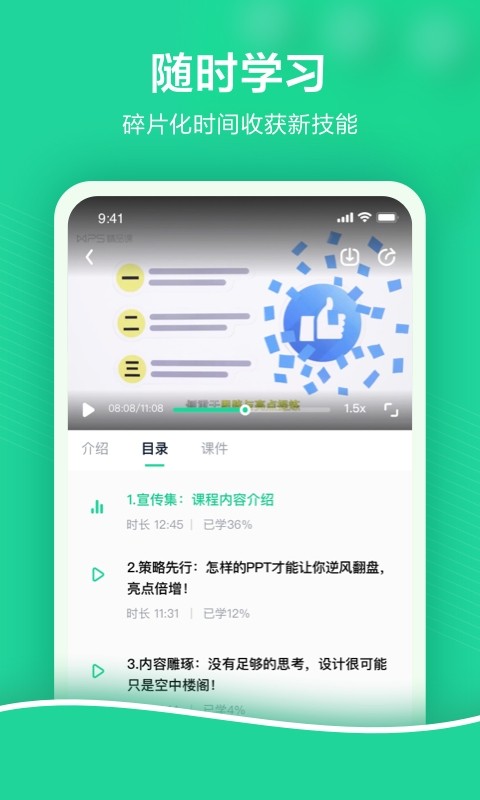 提供600余门精选好课和各种类型好书,涵盖了各行各业大咖经验方法,帮你快速提升职场核心竞争力! 让你利用碎片化时间上网课,提升职场硬实力!