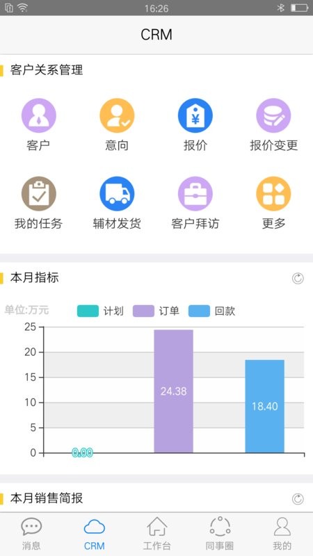 四目云管家最新版是一款提供移动办公管理服务的应用软件,打造掌上工作台,提供客户管理、报价变更、客户拜访、销售收款、工程任务单、工作日志、报价等服务,本月指标数据实时记录,一目了然,销售简报一手掌握,还有同事圈交流,接受实时消息,管理方便!
