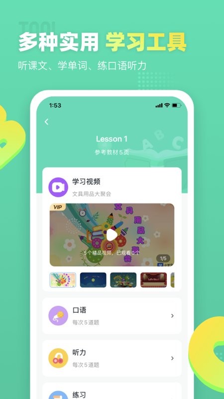 配备多种英语学习工具,覆盖听-说-读-写-练各个环节;