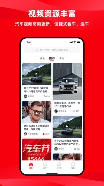 短视频查看。提供丰富的汽车行业相关视频供用户浏览查看,用户可点赞、评论,可在视频内跳转车辆信息页面进入车商店铺。用户可查看推荐视频、关注账号视频、本地视频。